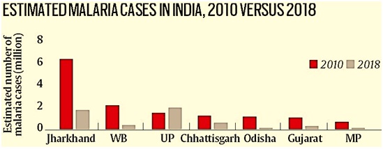 2010 की तुलना में 2018 में भारत में अनुमानित मलेरिया के मामले