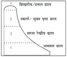 एल.सी. किंग के अनुसार, किसी आदर्श पहाड़ी ढाल के चार प्रमुख भाग होते हैं, जिन्हें ढाल के तत्व कहते हैं, तत्पश्चात, ....