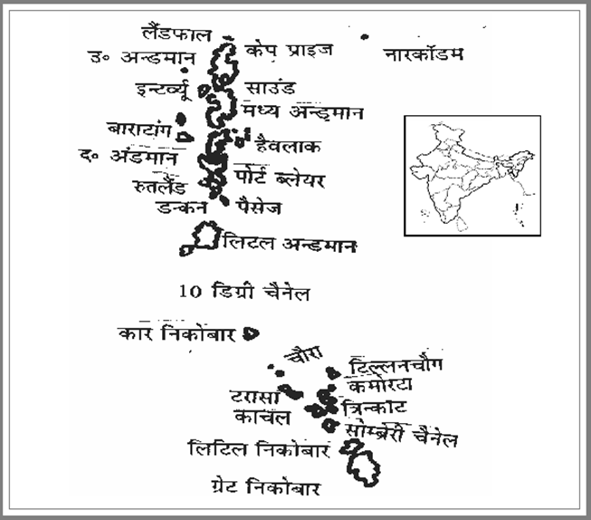 अंडमान के सबसे उत्तर में लैंडफाल द्वीप है, जिसके नीचे तीन मुख्य द्वीप-उत्तरी मध्य और दक्षिणी अंडमान है। इस क्षेत्र को ‘ग्रेट अंडमान’ कहा जाता है। यह द्वीप पांच द्वीपों का समूह है। दक्षिणी अंडमान में केंद्रशासित प्रदेश की राजधानी पोर्ट ब्लेयर है। इसके दक्षिण में छोटा अंडमान द्वीपसमूह है। यहां पर लगभग 204 छोटे-छोटे द्वीप हैं, जिनके दो प्रमुख समूह हैं-रिचि अक्रिपेलागो और लेवीरिथ द्वीपसमूह। अंडमान से दक्षिण की ओर अंडमान समुद्र तथा 10° चैनल जलधारा के दक्षिण में निकोबार द्वीप समूह है, जिसके सबसे उत्तर में कार निकोबार द्वीप है तथा सुदूर दक्षिण में इंदिरा प्वाइंट द्वीप है, जो भारत का सबसे दक्षिणी भाग है। यह भी छोटे तथा विशाल निकोबार में बंटा है। निकोबार द्वीप समूहों का कुल क्षेत्रफल 1953 वर्ग किमी. है। अंडमान के द्वीपसमूहों में महा अंडमानी, ओंगे, जरवा और सेंटीनली नाम की चार निग्रेटो जातियां हैं तथा निकोबार द्वीपसमूह में निकोबारी तथा शोमपेन नाम की दो मंगोलाइड जातियां हैं।