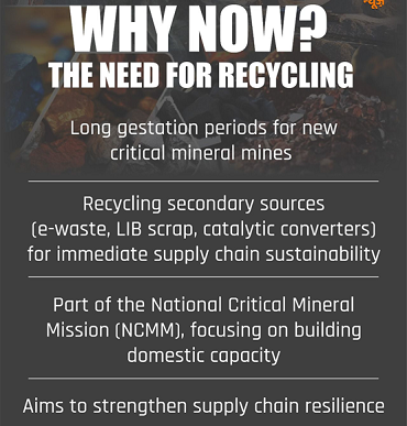 On 3rd September 2025, the Union Cabinet approved a Rs. 1,500 crore incentive scheme to develop recycling capacity in the country for the separation and production of critical minerals from secondary sources.